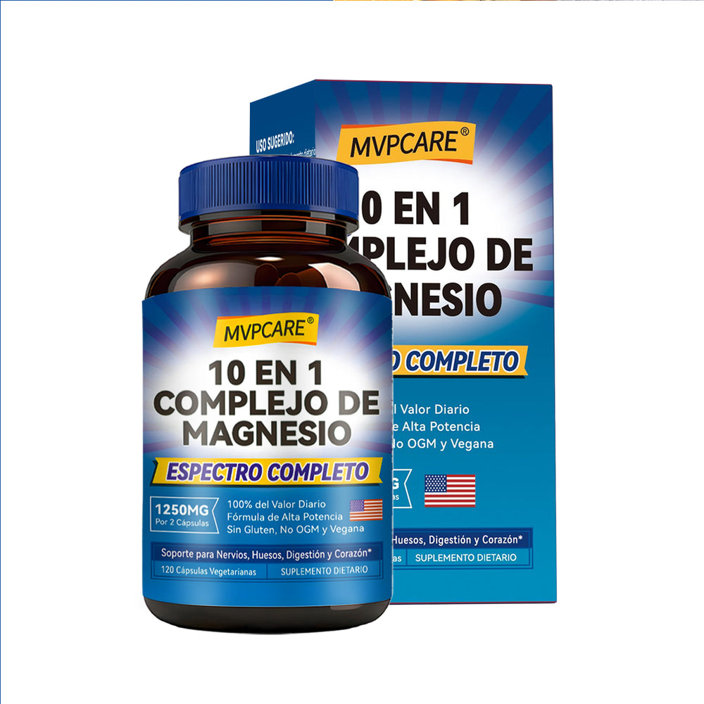 10 en 1 Complejo de magnesio 1250 mg | Ultra fuerte, máxima absorción | Suplemento de magnesio quelado para el sueño, los nervios y la salud cardíaca | Sin OGM, 120 cápsulas veganas