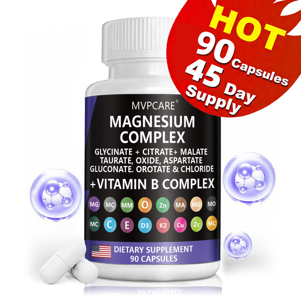 Mvpcare Complejo de magnesio 9 en 1, compuesto por glicinato de magnesio, citrato de magnesio, malato de magnesio, óxidos, taurato de magnesio, aspartato de magnesio, lactato de magnesio,cloruro de magnesio, y complejo de vitaminas C, B1,B2, B6 y B12 | 90 Cápsulas